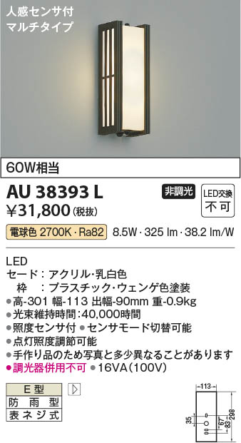 Koizumi コイズミ照明 LED防雨型ブラケット AU38393L