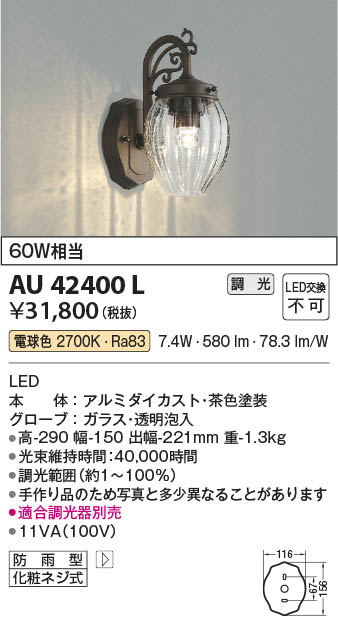 Koizumi コイズミ照明 LED防雨型ブラケット AU42400L