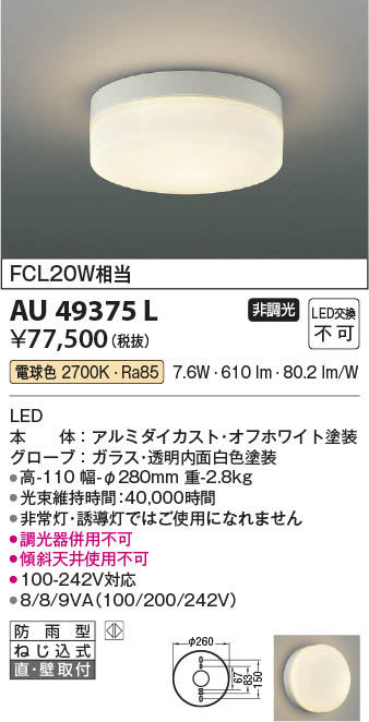 Koizumi コイズミ照明 LED防雨型シーリング AU49375L