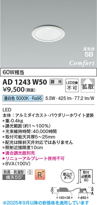 Koizumi コイズミ照明 LED高気密SBダウンライト AD1243W50