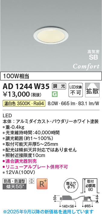 Koizumi コイズミ照明 LED高気密SBダウンライト AD1244W35