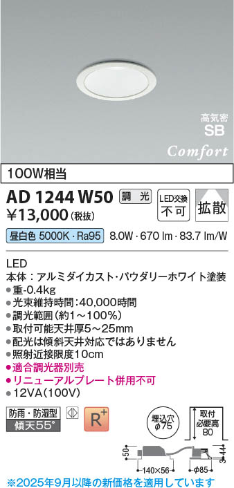 Koizumi コイズミ照明 LED高気密SBダウンライト AD1244W50
