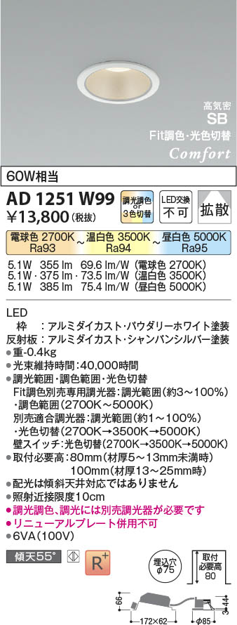 Koizumi コイズミ照明 LED高気密SBダウンライト AD1251W99