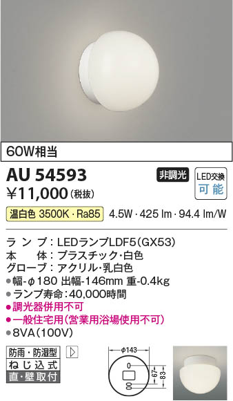 Koizumi コイズミ照明 LED防雨防湿型ブラケット AU54593
