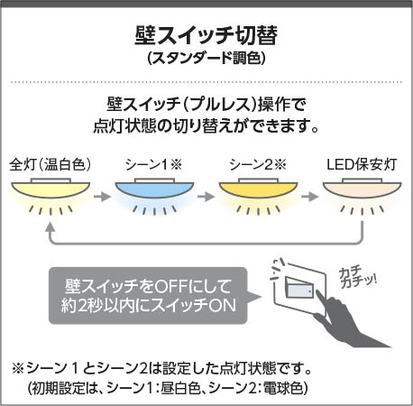 ●壁スイッチ:全灯→シーン1→シーン2→LED保安灯