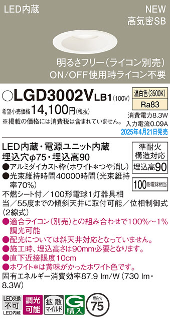 Panasonic ダウンライト LGD3002VLB1 | 商品情報 | LED照明器具・照明機器の激安通信販売・格安通販・業務用販売・見積もり販売 照明倉庫 -LIGHTING DEPOT-