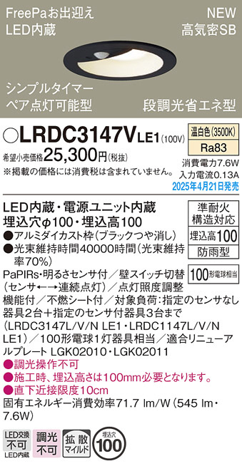 Panasonic エクステリアダウンライト LRDC3147VLE1