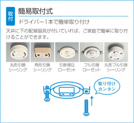 ※天井に「ローゼット」が付いている場合、木ネジは不要で天井を傷つけることなく簡単に取り付けられます。