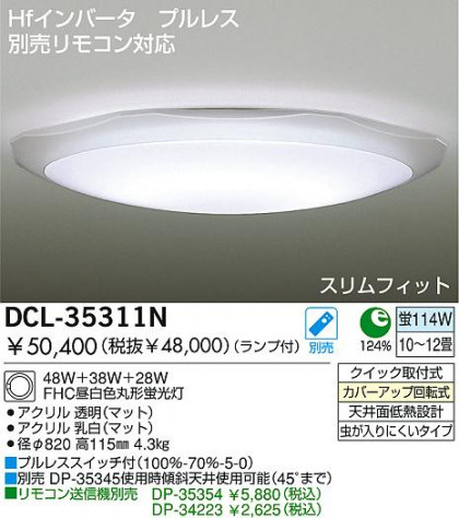 寸法:径φ820 高115mm 機能/他:■プルレススイッチ付(100%-70%-5-0)|■別売 DP-35345使用時傾斜天井使用可能(45°まで)|■液晶リモコン対応可能 DP-35354 ¥5,880(税込)|Hfインバータ プルレス|別売リモコン対応|スリムフィット 素材/色/仕上:アクリル 透明(マット)|アクリル 乳白(マット) 重量4.3kg ワット数蛍114W