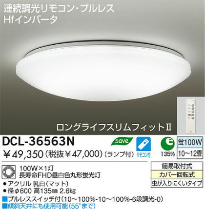 寸法:径φ600 高135mm 機能/他:■プルレススイッチ付(10〜100%-10〜100%-6段調光-0)|■傾斜天井にも使用可能(55°まで)|連続調光リモコン・プルレス|Hfインバータ|スリムフィットII|SAVE 素材/色/仕上:アクリル 乳白(マット) 重量2.6kg ワット数蛍100W
