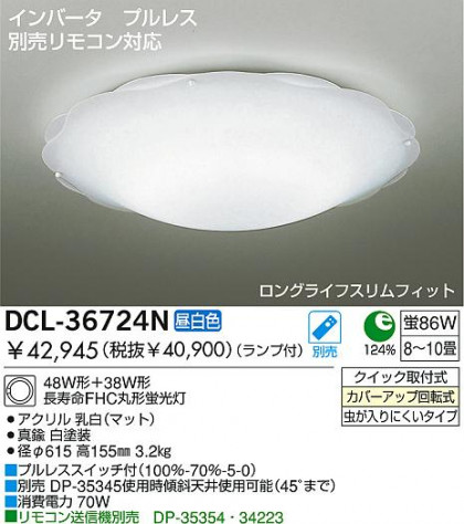 寸法:径φ615 高155mm 機能/他:■プルレススイッチ付(100%-70%-5-0)|■別売 DP-35345使用時傾斜天井使用可能(45°まで)|■液晶リモコン対応可能 DP-35354 ¥5,880(税込)|Hfインバータ プルレス|別売リモコン対応|ロングライフスリムフィット 素材/色/仕上:アクリル 乳白(マット)|真鍮 白塗装 重量3.2kg ワット数蛍86W