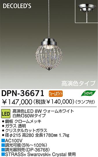 寸法:径φ215 高280 全長1780mm 機能/他:■AC100V|■調光可能(5%〜100%)|■調光器別売(DP-36768)|■STRASS(R) Swarovski(R) Crystal 使用|LED (白熱灯 60Wタイプ)|高演色タイプ|SAVE 素材/色/仕上:鋼板 クロームメッキ|ガラス 透明|クリスタルカットガラス 重量1.7kg ワット数