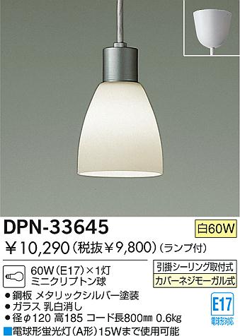 寸法:径φ120 高185 コード長800mm 機能/他:■電球形蛍光灯(A形)15Wまで使用可能 素材/色/仕上:鋼板 メタリックシルバー塗装|ガラス 乳白消し 重量0.6kg ワット数白60W