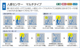 機能/他:■点灯照度調節機能付(15・45lx)|■点灯保持時間60秒|消費電力 54W|マルチタイプ|人感センサー|防雨形|SAVE