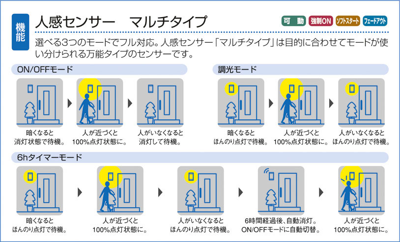 機能/他:■点灯照度調節機能付(15・45lx)|■点灯保持時間60秒|消費電力 36W|マルチタイプ|人感センサー|防雨形|SAVE