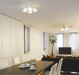 品名:蛍光直付シャンデリア 畳数:4.5〜6畳 光源光色:蛍光灯(電球色)蛍60W 電球形蛍光ランプA15形(E17)×4 鋼・オフホワイト塗装 ガラス・乳白色消し 高-167 幅-φ412mm 重-2.1kg” 白熱球60W×4灯相当の明るさ|※インテリアファンには取付けられません