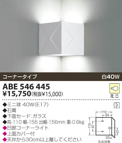 品名:白熱灯ブラケット 畳数: 光源光色:白熱灯白40W ミニ球40W(E17) 石膏 下面セード:ガラス 高-110 幅-156 出幅-156mm 重-0.6kg” 凹部コーナーライト 上面カバー付 天井から30cm以上離してください
