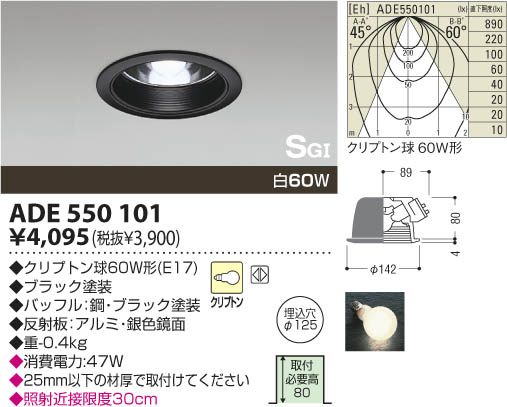 品名:SG形ダウンライト 畳数: 光源光色:白熱灯白60W クリプトン球60W形(E17) ブラック塗装 バッフル:鋼・ブラック塗装 反射板:アルミ・銀色鏡面 幅-φ142 出幅-4 埋込穴径-φ125 埋込高-80 取付必要高-80mm 重-0.4kg” 25mm以下の材厚で取付けてください 照射近接限度30cm