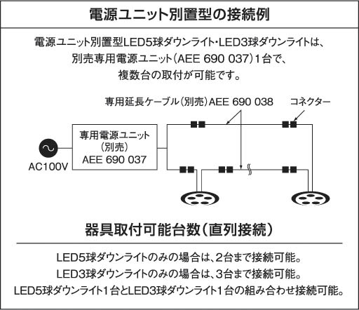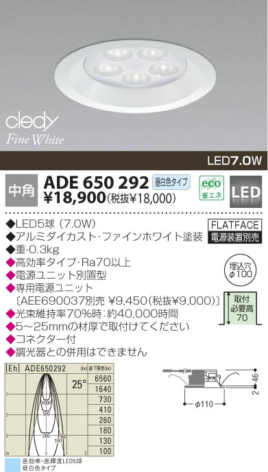 品名:LEDダウンライト 畳数: 光源光色:LED(昼白色タイプ)LED7.0W LED5球(7.0W) アルミダイカスト・ファインホワイト塗装 幅-φ110 出幅-2 埋込穴径-φ100 埋込高-46 取付必要高-70mm 重-0.3kg” 高効率タイプ・Ra70以上 電源ユニット別置型 専用電源ユニット〔AEE690037別売 ¥9
