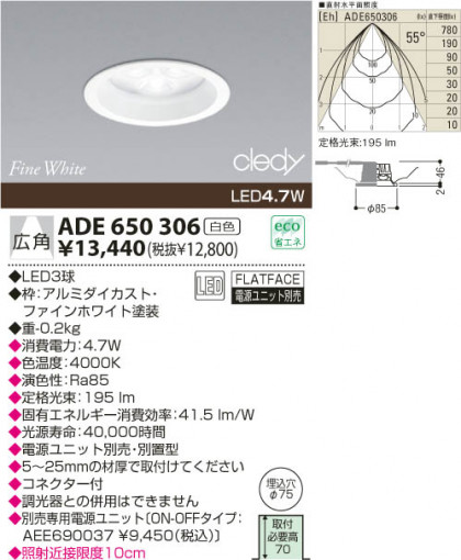 品名:LEDダウンライト 畳数: 光源光色:LED(白色タイプ)LED4.7W LED3球(4.7W) アルミダイカスト・ファインホワイト塗装 幅-φ85 出幅-2 埋込穴径-φ75 埋込高-46 取付必要高-70mm 重-0.2kg” 高演色タイプ・Ra90以上 電源ユニット別置型 専用電源ユニットAEE690037別売