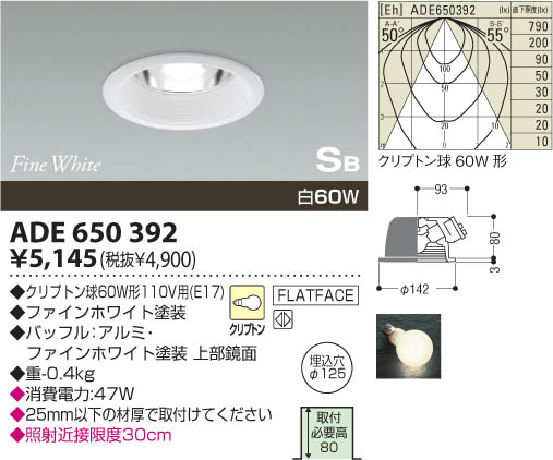 品名:高気密ダウンライト 畳数: 光源光色:白熱灯白60W クリプトン球60W形110V用(E17) ファインホワイト塗装 バッフル:アルミ・ファインホワイト塗装 上部鏡面” 幅-φ142 出幅-3 埋込穴径-φ125 埋込高-80 取付必要高-80mm 重-0.4kg” 25mm以下の材厚で取付けてください 照射近接限度30cm