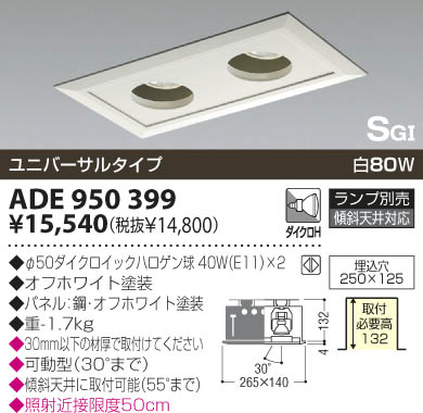 品名:SG形ダウンライト 畳数: 光源光色:白80W φ50ダイクロイックハロゲン球40W(E11)×2 オフホワイト塗装 パネル:鋼・オフホワイト塗装 幅-265×140 出幅-4 埋込穴径-250×125 埋込高-132 取付必要高-132mm 重-1.7kg” 30mm以下の材厚で取付けてください 可動型(30°まで) 傾斜天井に取付可能(55°まで) 照射近接限度50cm