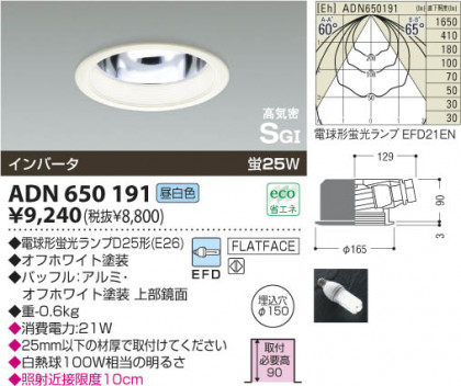 品名:高気密ダウンライト 畳数: 光源光色:蛍光灯(昼白色)蛍25W 電球形蛍光ランプD25形(E26) オフホワイト塗装 バッフル:アルミ・オフホワイト塗装 上部鏡面” 幅-φ165 出幅-3 埋込穴径-φ150 埋込高-90 取付必要高-90mm 重-0.6kg” 25mm以下の材厚で取付けてください 白熱球100W相当の明るさ 照射近接限度10cm