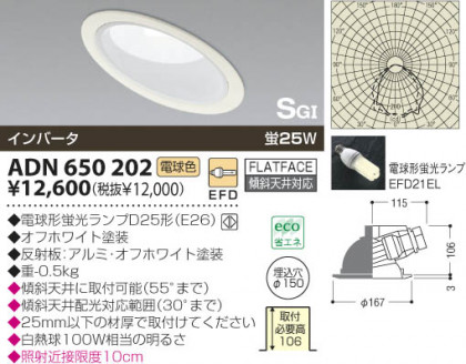 品名:SG形ダウンライト 畳数: 光源光色:蛍光灯(電球色)蛍25W 電球形蛍光ランプD25形(E26) オフホワイト塗装 反射板:アルミ・オフホワイト塗装 幅-φ167 出幅-3 埋込穴径-φ150 埋込高-106 取付必要高-106mm 重-0.5kg” 傾斜天井に取付可能(55°まで) 傾斜天井配光対応範囲(30°まで) 25mm以下の材厚で取付けてください 白熱球100W相当の明るさ 照射近接限度10cm
