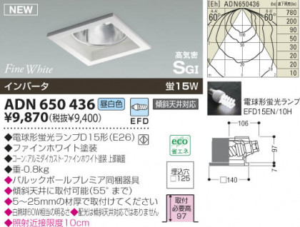 品名:高気密ダウンライト 畳数: 光源光色:蛍光灯(昼白色)蛍15W 電球形蛍光ランプD15形(E26) ファインホワイト塗装 コーン:アルミダイカスト・ファインホワイト塗装 上部鏡面” 幅-□140 出幅-7 埋込穴径-□125 埋込高-97 取付必要高-97mm 重-0.8kg” パルックボールプレミア同梱器具 傾斜天井に取付可能(55°まで) 5〜25mmの材厚で取付けてください 白熱球60W相当の明るさ 配光は傾斜天井対応ではありません 照射近接限度10cm