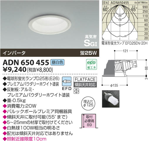 品名:高気密ダウンライト 畳数: 光源光色:蛍光灯(昼白色)蛍25W 電球形蛍光ランプD25形(E26) プレミアムパウダリーホワイト塗装 反射板:アルミ・プレミアムパウダリーホワイト塗装 幅-φ135 出幅-3 埋込穴径-φ125 埋込高-88 取付必要高-89mm 重-0.5kg” パルックボールプレミア同梱器具 傾斜天井に取付可能(55°まで) 5〜25mmの材厚で取付けてください 白熱球100W相当の明るさ 配光は傾斜天井対応ではありません 照射近接限度10cm