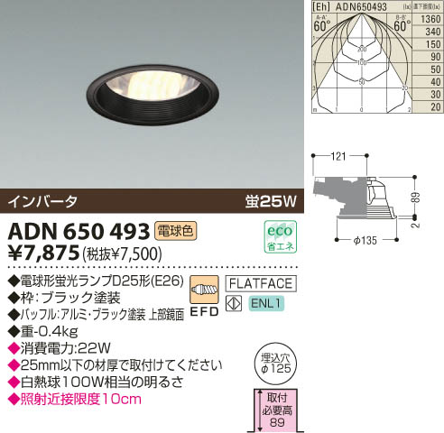 品名:蛍光灯ダウンライト 畳数: 光源光色:蛍光灯(電球色)蛍25W 電球形蛍光ランプD25形(E26) ブラック塗装 バッフル:アルミ・ブラック塗装 バッフル:アルミ・上部鏡面 幅-φ135 出幅-2 埋込穴径-φ125 埋込高-89 取付必要高-89mm 重-0.5kg” 25mm以下の材厚で取付けてください 白熱球100W相当の明るさ 照射近接限度10cm