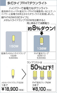 品名:蛍光灯ダウンライト 畳数: 光源光色:蛍126W コンパクト蛍光ランプFHT42W×3 オフホワイト塗装 反射板:アルミ・銀色鏡面 幅-φ272 出幅-6 埋込穴径-φ250 埋込高-243 取付必要高-243mm 重-2.4kg” 天井よりランプ交換可能 100V/200V対応タイプ 照射近接限度50cm|”消費効率61.0lm/W (8