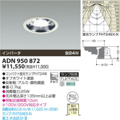 品名:蛍光灯ダウンライト 畳数: 光源光色:蛍24W コンパクト蛍光ランプFHT24W オフホワイト塗装 反射板:アルミ・銀色鏡面 幅-φ135 出幅-2 埋込穴径-φ125 埋込高-100 取付必要高-135mm 重-0.7kg” 100V/200V対応タイプ 照射近接限度10cm