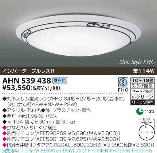 品名:蛍光灯シーリング 畳数:10〜12畳 光源光色:蛍光灯(昼白色)蛍114W 丸形スリム蛍光ランプFHC34形+27形+20形(豆球付)〔高出力点灯48W+38W+28W〕 アクリル・乳白色 飾:プラスチック・黒色 全灯→全灯段調光→豆球 高-134 幅-φ630mm 重-3.1kg” 虫などの入りにくい構造 別売リモコンAEE590269