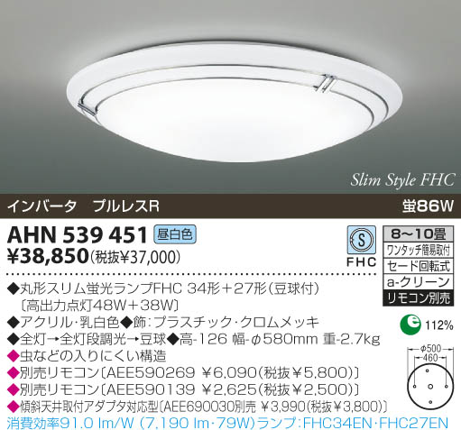 品名:蛍光灯シーリング 畳数:8〜10畳 光源光色:蛍光灯(昼白色)蛍86W 丸形スリム蛍光ランプFHC34形+27形(豆球付)〔高出力点灯48W+38W〕 アクリル・乳白色 飾:プラスチック・クロムメッキ 全灯→全灯段調光→豆球 高-126 幅-φ580mm 重-2.7kg” 虫などの入りにくい構造 別売リモコンAEE590269