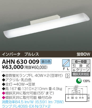 品名:蛍光灯シーリング 畳数:6〜8畳 光源光色:蛍光灯(昼白色)蛍80W 直管蛍光ランプFL40W×2(豆球付) アクリル・乳白色 全灯→40W→豆球 高-167 幅-1310×210mm 重-4.9kg” 傾斜天井に取付可能(55°まで) 傾斜天井に取付可能 横付のみ”|”消費効率84.5lm/W (6
