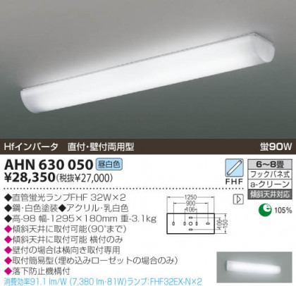 品名:蛍光灯シーリング 畳数:6〜8畳 光源光色:蛍光灯(昼白色)蛍90W 直管蛍光ランプFHF32W×2 鋼・白色塗装 アクリル・乳白色 高-98 幅-1295×180mm 重-3.1kg” 傾斜天井に取付可能(90°まで) 傾斜天井に取付可能 横付のみ” 壁付の場合は横向き取付専用 取付簡易型(埋め込みローゼットの場合のみ) 落下防止機構付|”消費効率91.1lm/W (7