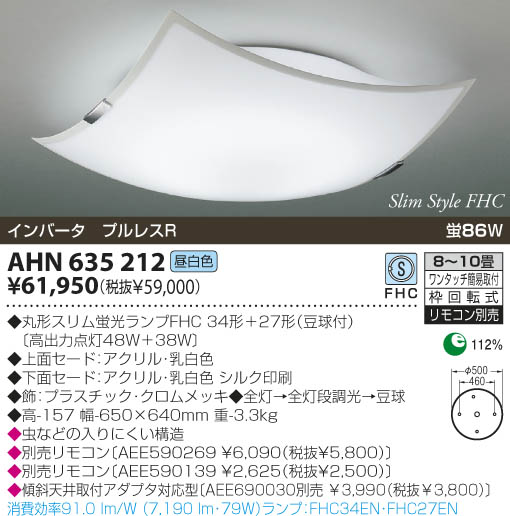 品名:蛍光灯シーリング 畳数:8〜10畳 光源光色:蛍光灯(昼白色)蛍86W 丸形スリム蛍光ランプFHC34形+27形(豆球付)〔高出力点灯48W+38W〕 上面セード:アクリル・乳白色 下面セード:アクリル・乳白色 シルク印刷” 飾:プラスチック・クロムメッキ 全灯→全灯段調光→豆球 高-157 幅-650×640mm 重-3.3kg” 虫などの入りにくい構造 別売リモコン〔AEE590269 ¥6