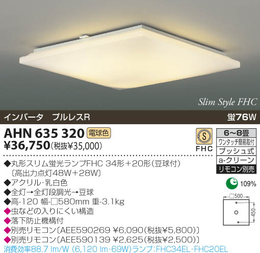 品名:蛍光灯シーリング 畳数:6〜8畳 光源光色:蛍光灯(電球色)蛍76W 丸形スリム蛍光ランプFHC34形+20形(豆球付)〔高出力点灯48W+28W〕 アクリル・乳白色 全灯→全灯段調光→豆球 高-120 幅-□580mm 重-3.1kg” 虫などの入りにくい構造 落下防止機構付 別売リモコンAEE590269
