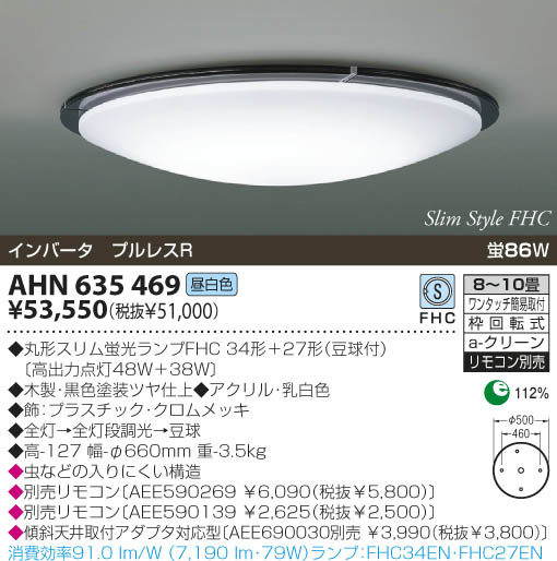 品名:蛍光灯シーリング 畳数:8〜10畳 光源光色:蛍光灯(昼白色)蛍86W 丸形スリム蛍光ランプFHC34形+27形(豆球付)〔高出力点灯48W+38W〕 木製・黒色塗装ツヤ仕上 アクリル・乳白色 飾:プラスチック・クロムメッキ 全灯→全灯段調光→豆球 高-127 幅-φ660mm 重-3.5kg” 虫などの入りにくい構造 別売リモコンAEE590269