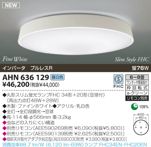 品名:蛍光灯シーリング 畳数:6〜8畳 光源光色:蛍光灯(昼白色)蛍76W 丸形スリム蛍光ランプFHC34形+20形(豆球付)〔高出力点灯48W+28W〕 木製・ファインホワイト アクリル・乳白色 全灯→全灯段調光→豆球 高-114 幅-φ566mm 重-3.2kg” 虫などの入りにくい構造 別売リモコンAEE590269別売