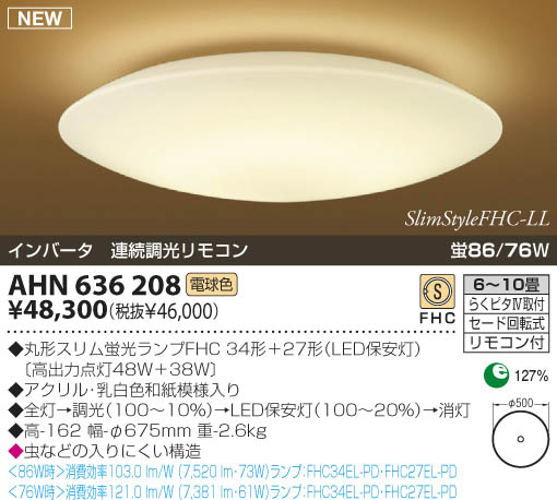 品名:和風蛍光灯シーリング 畳数:6〜10畳 光源光色:蛍光灯(電球色)蛍86W/76W 丸形スリム蛍光ランプFHC34形+27形(LED保安灯)〔高出力点灯48W+38W〕 アクリル・乳白色和紙模様入り 全灯→調光(100〜10%)→LED保安灯(100〜20%)→消灯 高-162 幅-φ675mm 重-2.6kg” 虫などの入りにくい構造|”〈86W時〉消費効率103.0lm/W (7