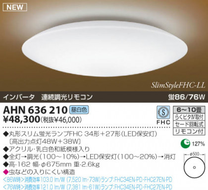 品名:和風蛍光灯シーリング 畳数:6〜10畳 光源光色:蛍光灯(昼白色)蛍86W/76W 丸形スリム蛍光ランプFHC34形+27形(LED保安灯)〔高出力点灯48W+38W〕 アクリル・乳白色和紙模様入り 全灯→調光(100〜10%)→LED保安灯(100〜20%)→消灯 高-162 幅-φ675mm 重-2.6kg” 虫などの入りにくい構造|”〈86W時〉消費効率103.0lm/W (7