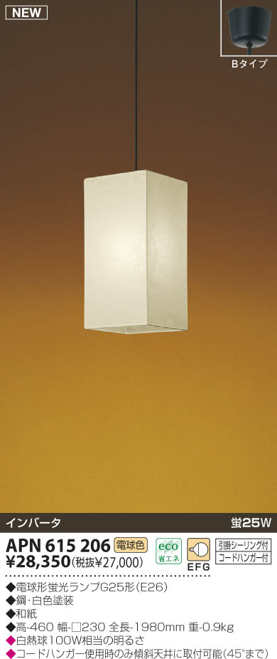 品名:和風蛍光灯ペンダント 光源光色:蛍光灯(電球色)蛍25W 電球形蛍光ランプG25形(E26) 鋼・白色塗装 和紙 高-460 幅-□230 全長-1980mm 重-0.9kg 白熱球100W相当の明るさ コードハンガー使用時のみ傾斜天井に取付可能(45°まで)