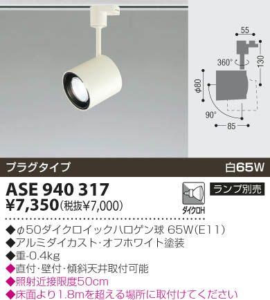 品名:スポットライト(プラグ) 畳数: 光源光色:白65W φ50ダイクロイックハロゲン球65W(E11) アルミダイカスト・オフホワイト塗装 高-130 本体長-85 本体幅-φ80mm 重-0.4kg” 直付・壁付・傾斜天井取付可能 照射近接限度50cm 床面より1.8mを超える場所に取付けてください