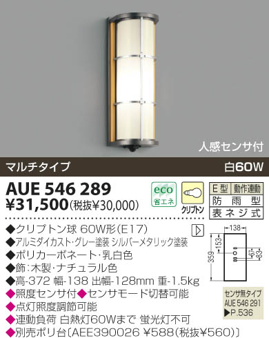 品名:防雨型ブラケット 光源光色:白熱灯白60W クリプトン球60W形(E17) アルミダイカスト・グレー塗装 シルバーメタリック塗装 ポリカーボネート・乳白色 飾:木製・ナチュラル色 高-372 幅-138 出幅-128mm 重-1.5kg” 照度センサ付 センサモード切替可能 点灯照度調節可能 連動負荷 白熱灯60Wまで 蛍光灯不可 別売ポリ台〔AEE390026 ¥588(税抜¥560)〕