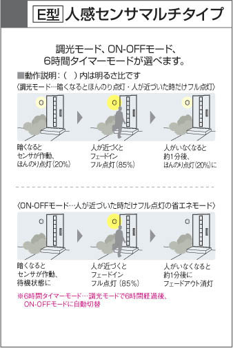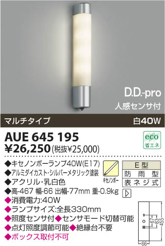 品名:防雨型ブラケット 光源光色:白熱灯白40W キセノンボーランプ40W(E17) アルミダイカスト・シルバーメタリック塗装 アクリル・乳白色 高-467 幅-66 出幅-77mm 重-0.9kg ランプサイズ・全長330mm 照度センサ付 センサモード切替可能 点灯照度調節可能 絶縁台不要 ボックス取付不可