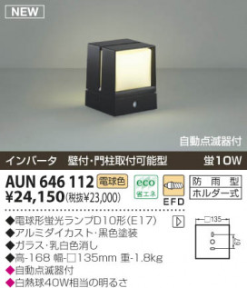 品名:防雨型ブラケット 光源光色:蛍光灯(電球色)蛍10W 電球形蛍光ランプD10形(E17) アルミダイカスト・黒色塗装 ガラス・乳白色消し 幅-□135 出幅-168mm 重-1.8kg 自動点滅器付 白熱球40W相当の明るさ 絶縁台不要