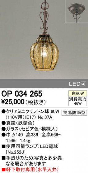 寸法:径φ140 高386 全高566〜1,966 重量:1.4kg 材質:●真鍮(鉄錆色塗装)|●ガラス(セピア色・模様入) 総W数:60W 省エネ達成率: ランプ名称:クリアミニクリプトン球 ランプ本数:1本 光源色: 軒下取付専用(水平天井)