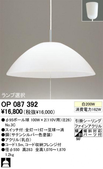 寸法:径φ550 高283 全高1,070〜1,870 重量:1.2kg 材質:●鋼(サテンシルバー色塗装)|●アクリル(乳白) 総W数:200W 省エネ達成率: ランプ名称:φ95ボール球 ランプ本数:2本 光源色: